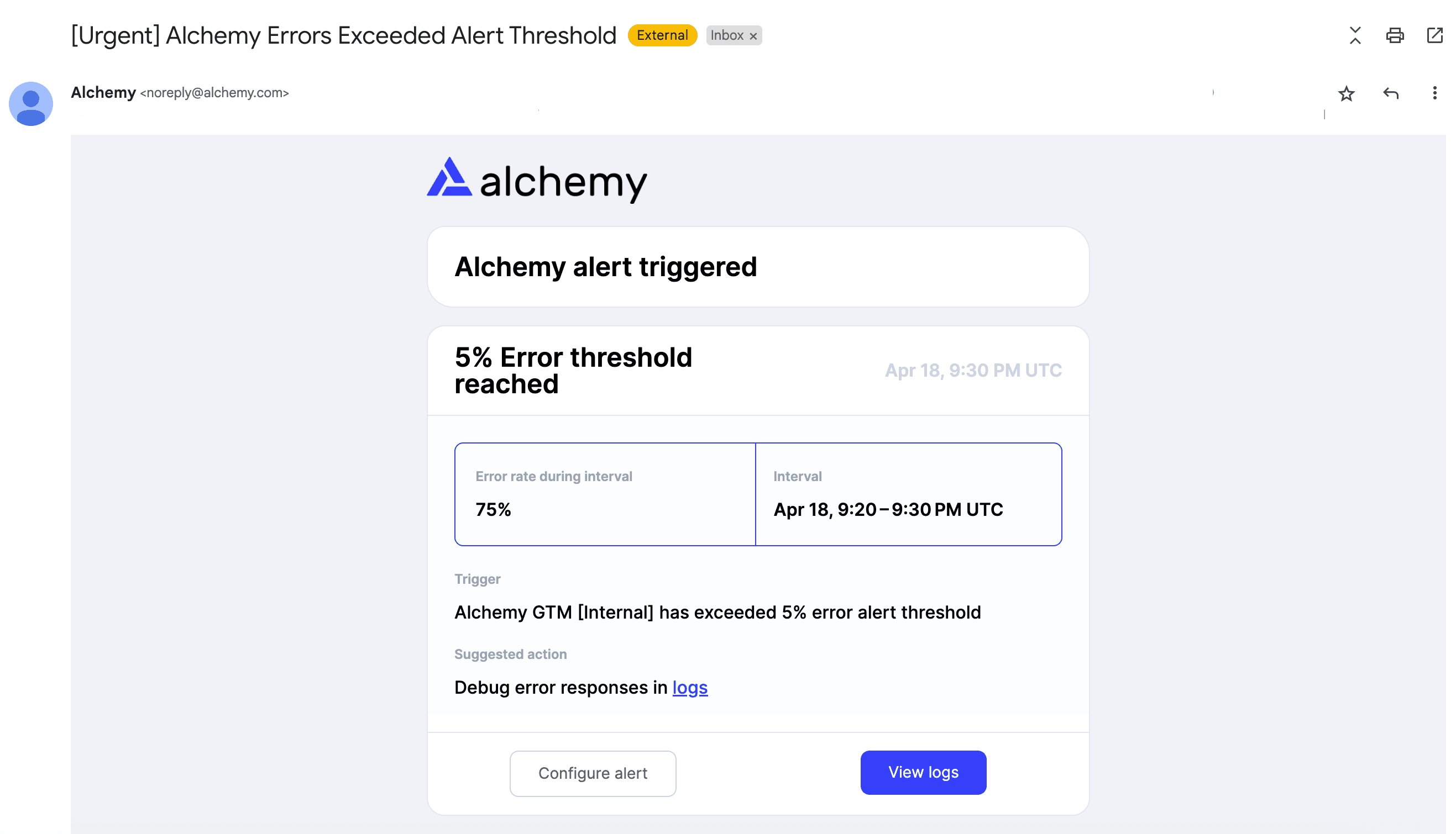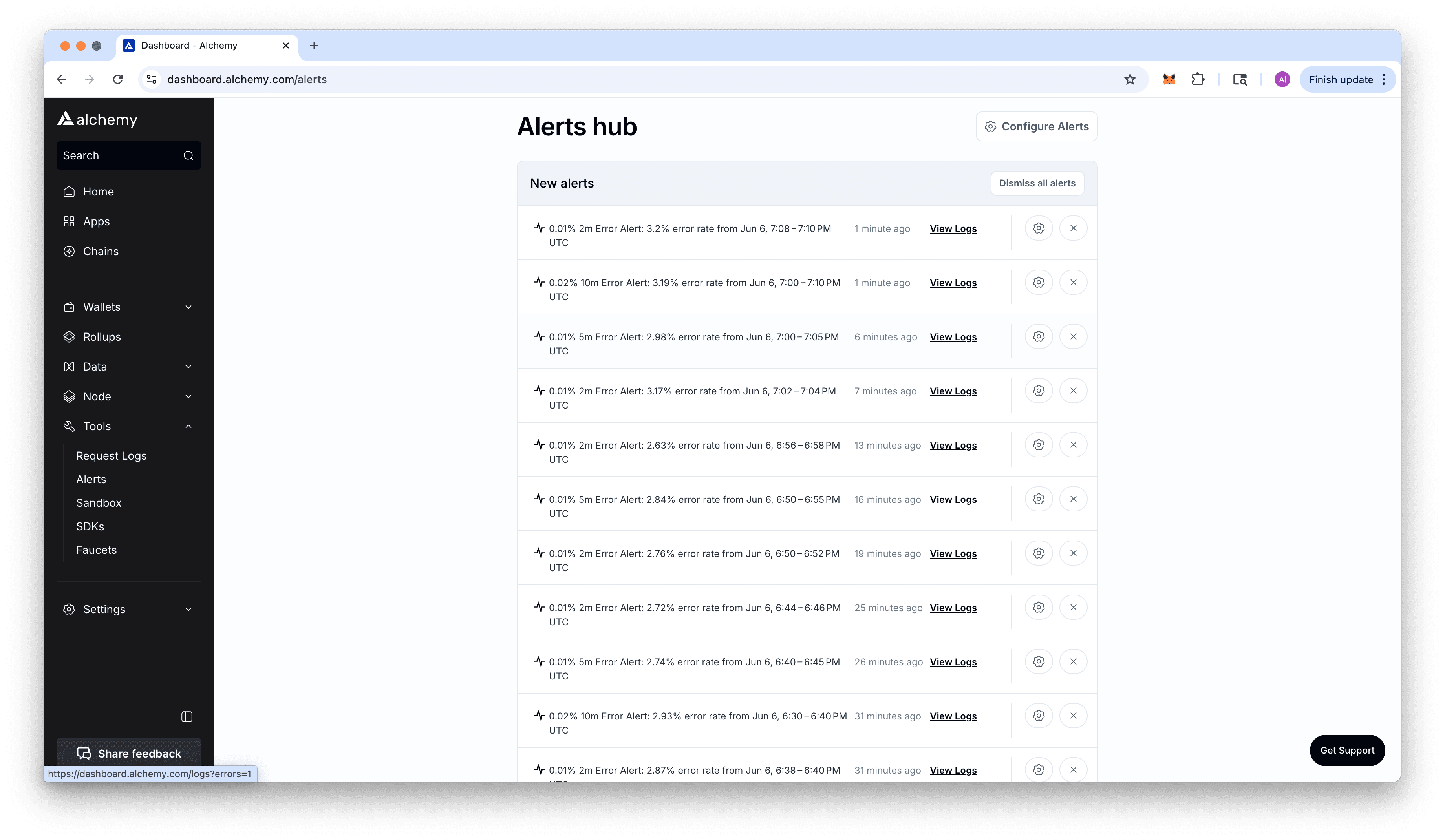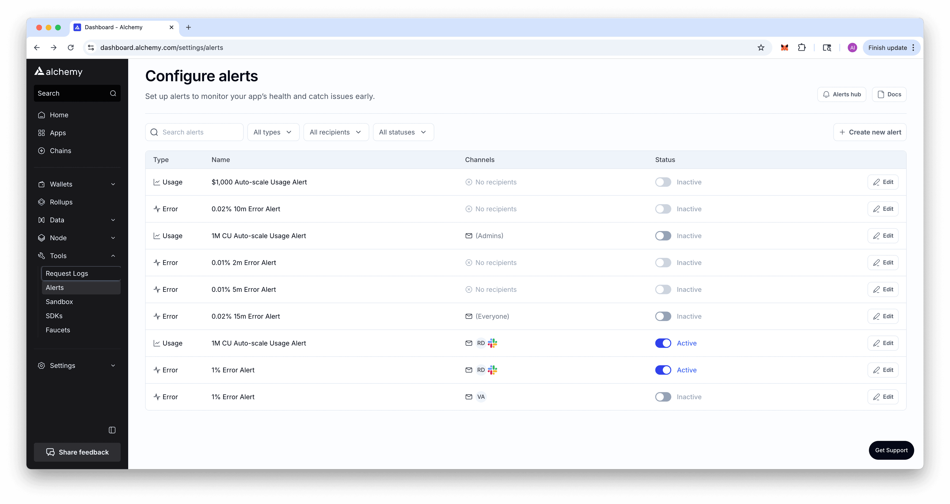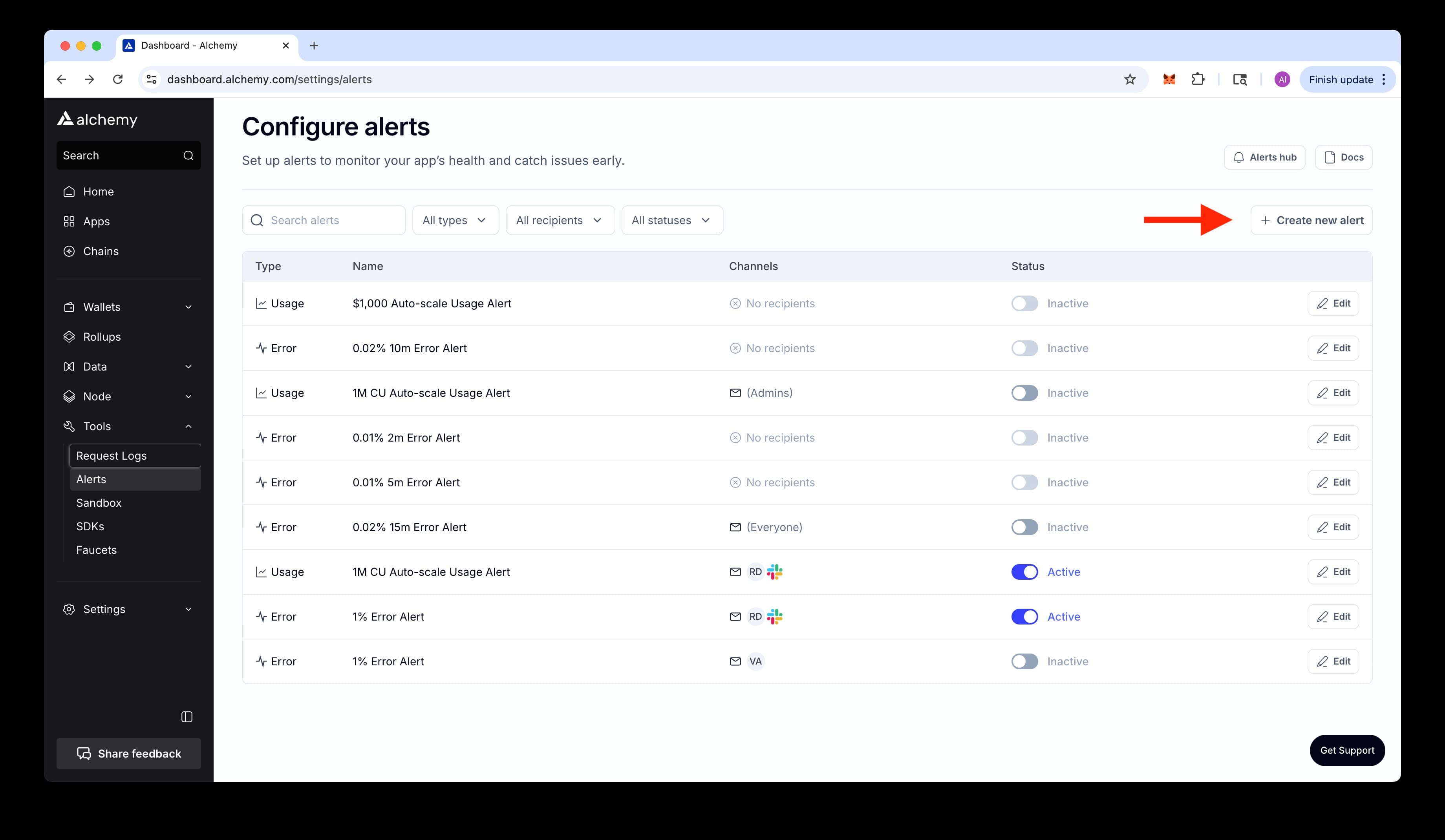 Follow these steps to configure alerts in the Alchemy Dashboard.
