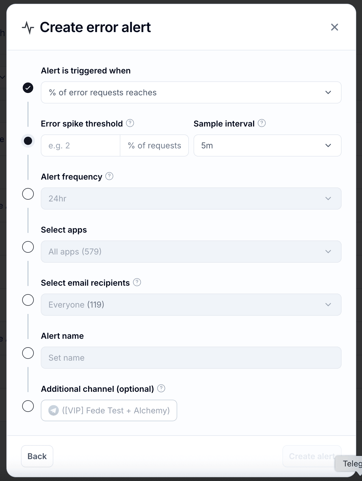 - Error rate alerts: Receive alerts when your error rates reach a specified threshold across all your apps in a certain time interval. For instance, get an alert if 5% of your requests in the past 10 minutes are errors.