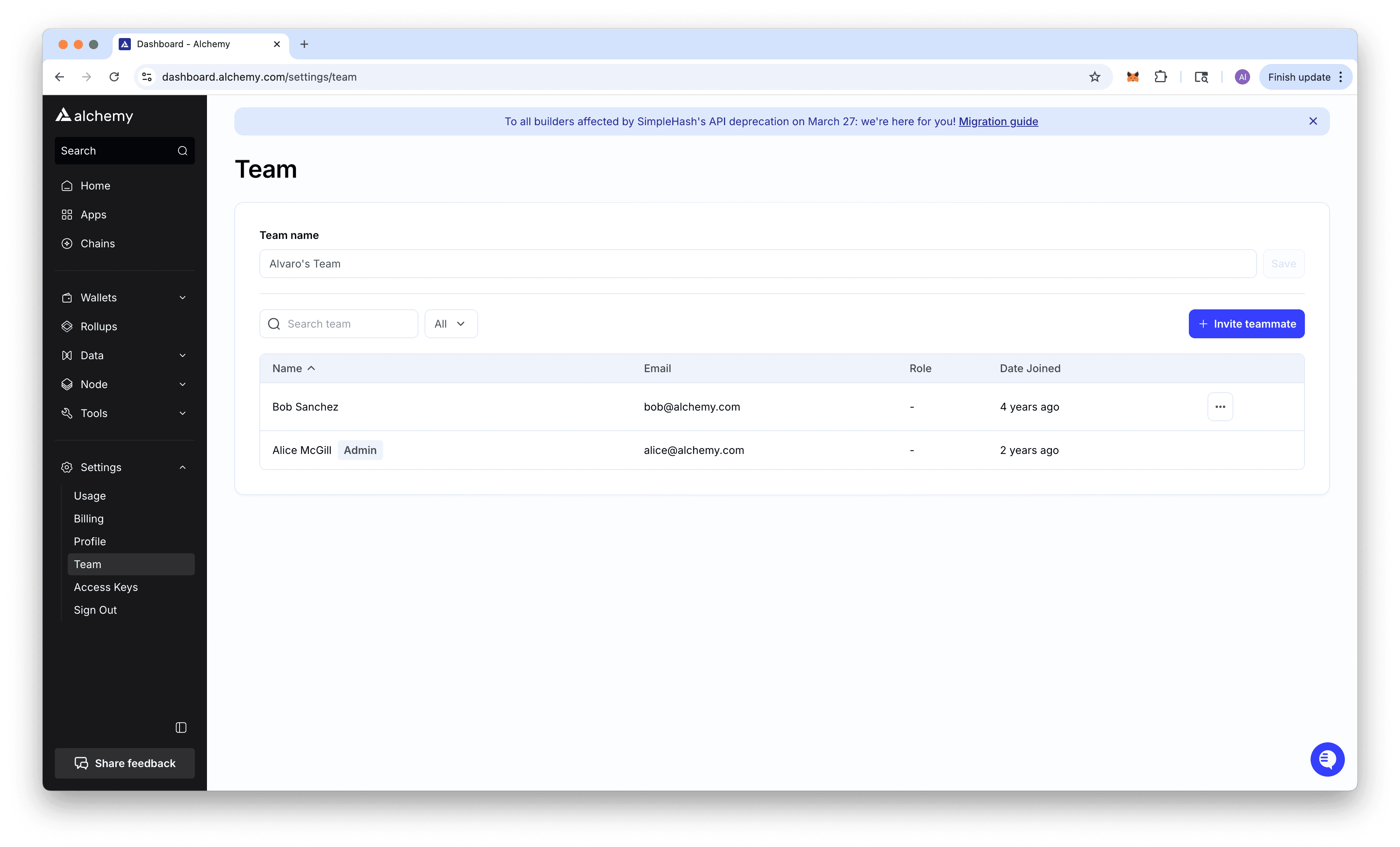 The Alchemy Dashboard provides a default Team to manage your Alchemy apps. Here are the roles available in an Alchemy team, including role powers: