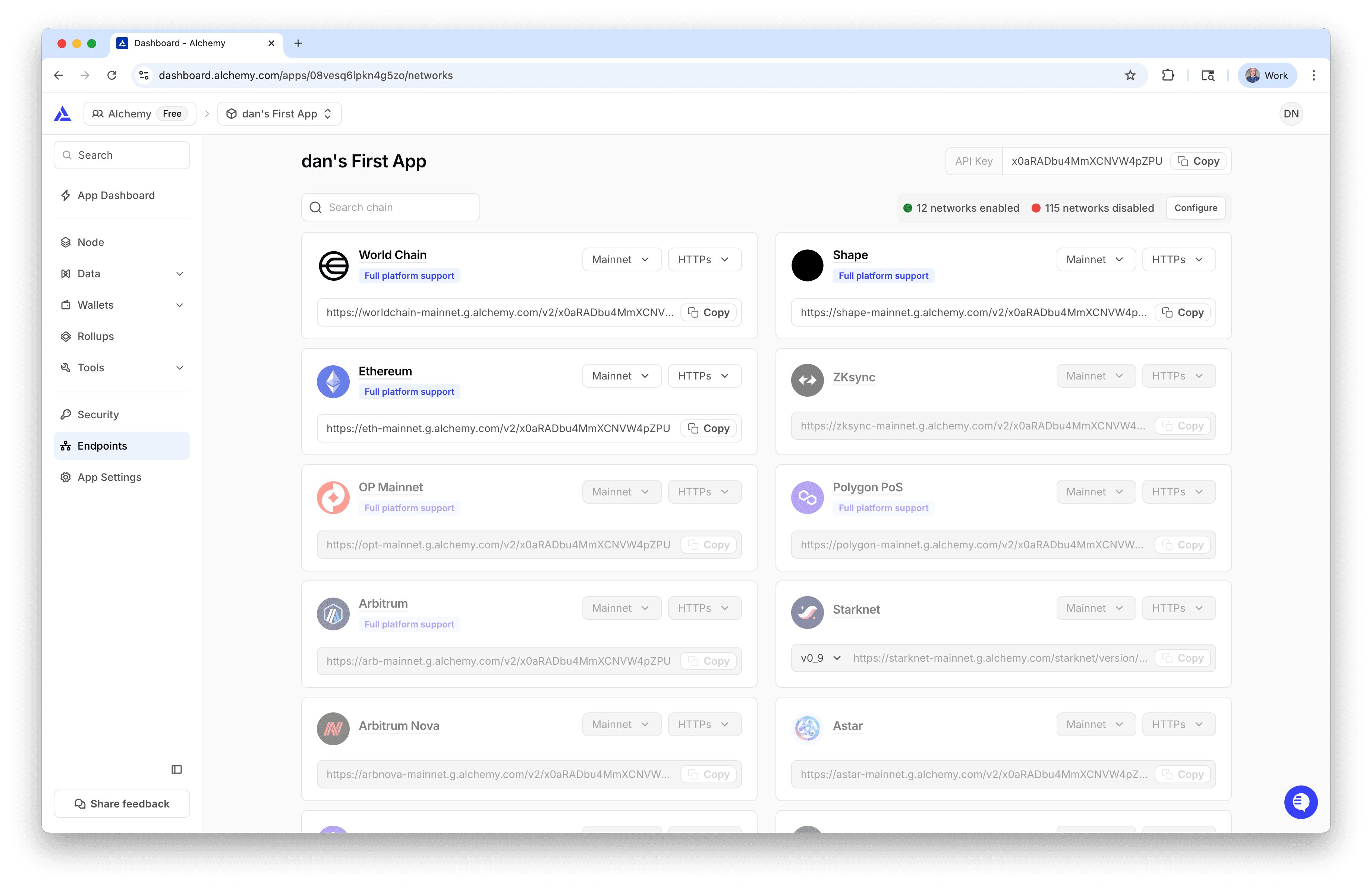 The API Key will be enabled on the chains you selected in the previous steps, switch to the "Endpoints" tab to toggle certain chains and view the request URLs (which contain your generated API key!).