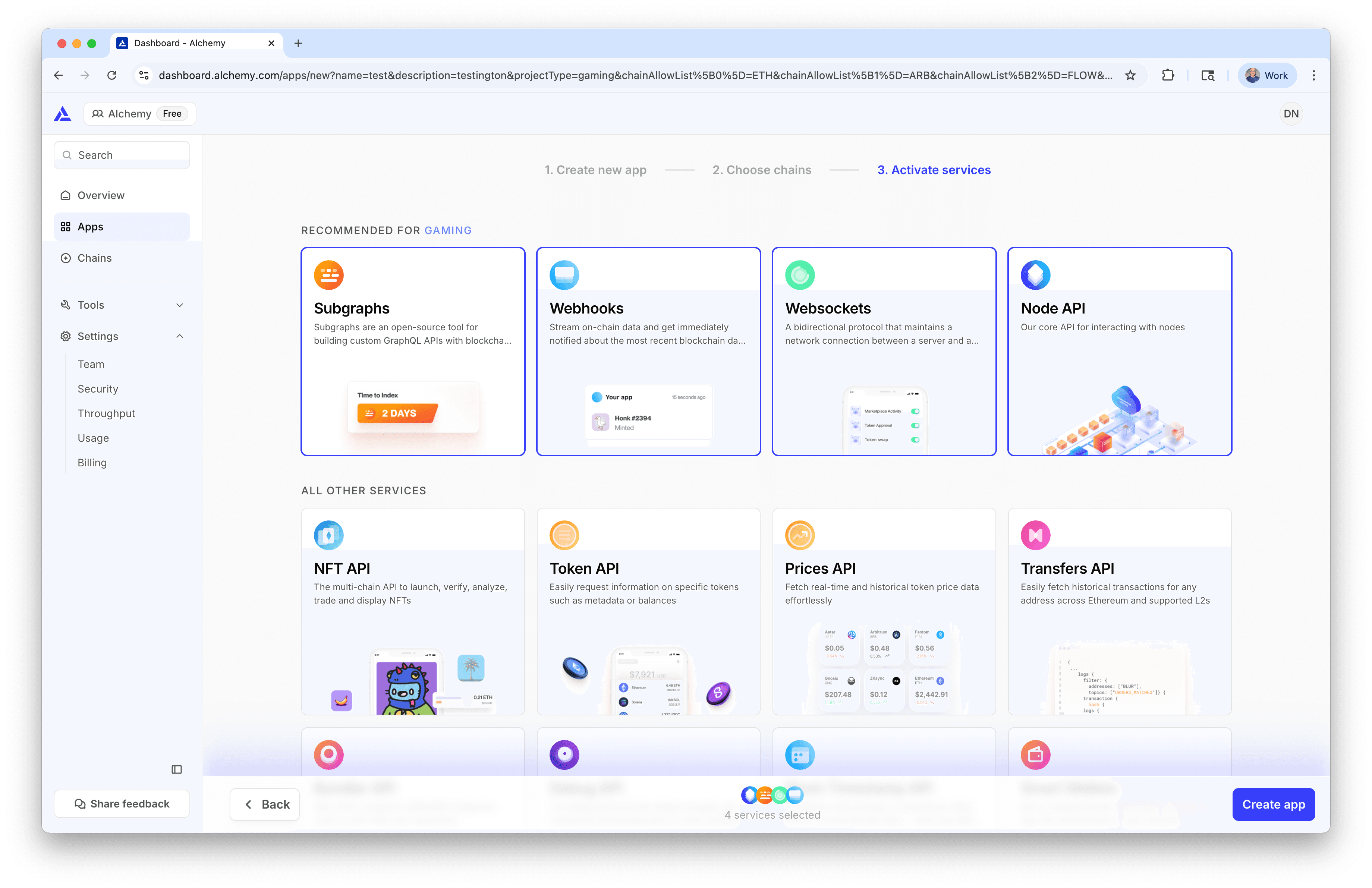 As the last step, you can select what services to activate on your application. You can come back and change these any time! Then select "Create App":