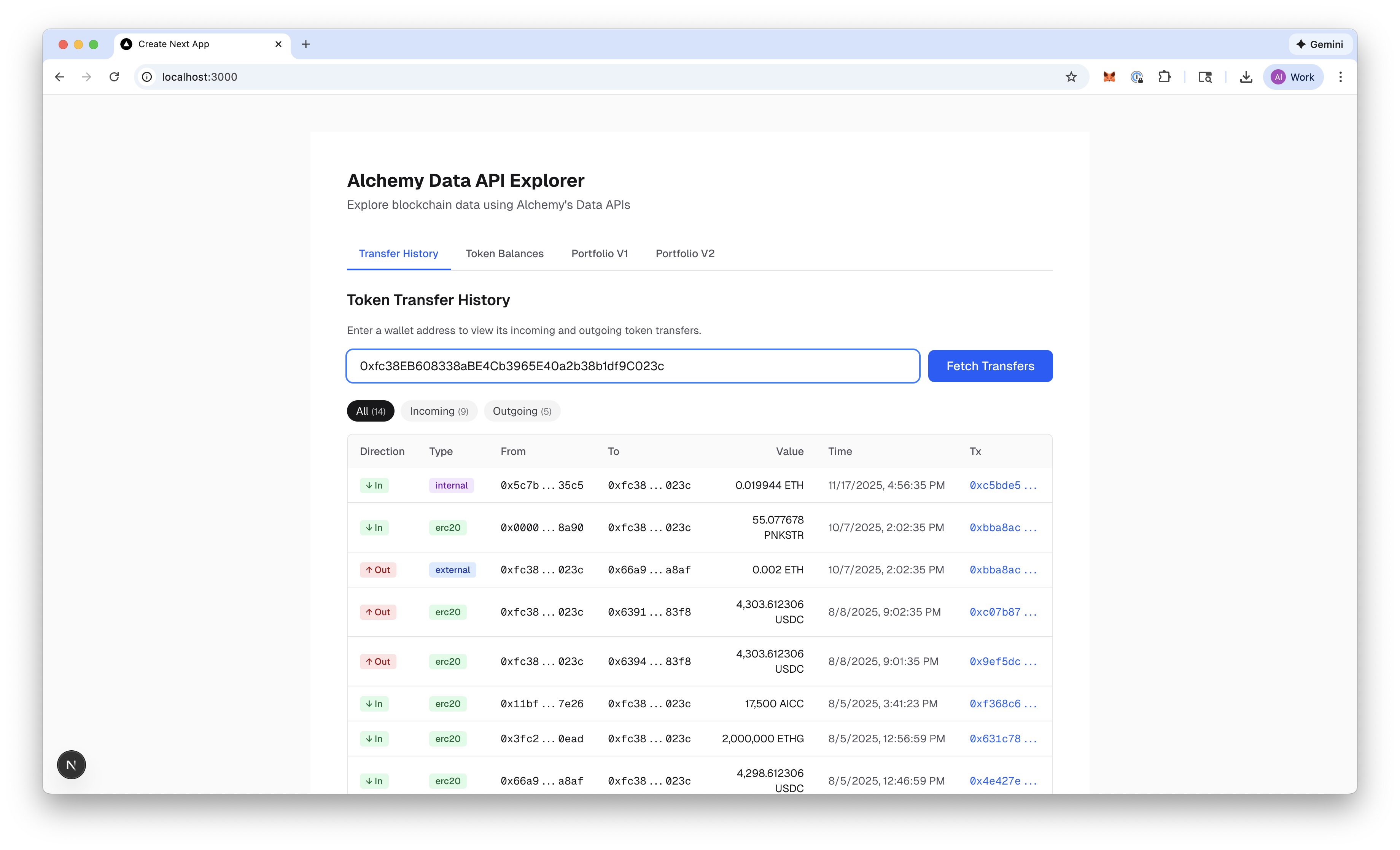 - Prompt: Build a simple React component that takes a wallet address and uses Alchemy’s Transfers API to show a chronological list of incoming and outgoing token transfers. Add this component as a tab in the main page, as I will add more components and I want them to be separated by tabs.
