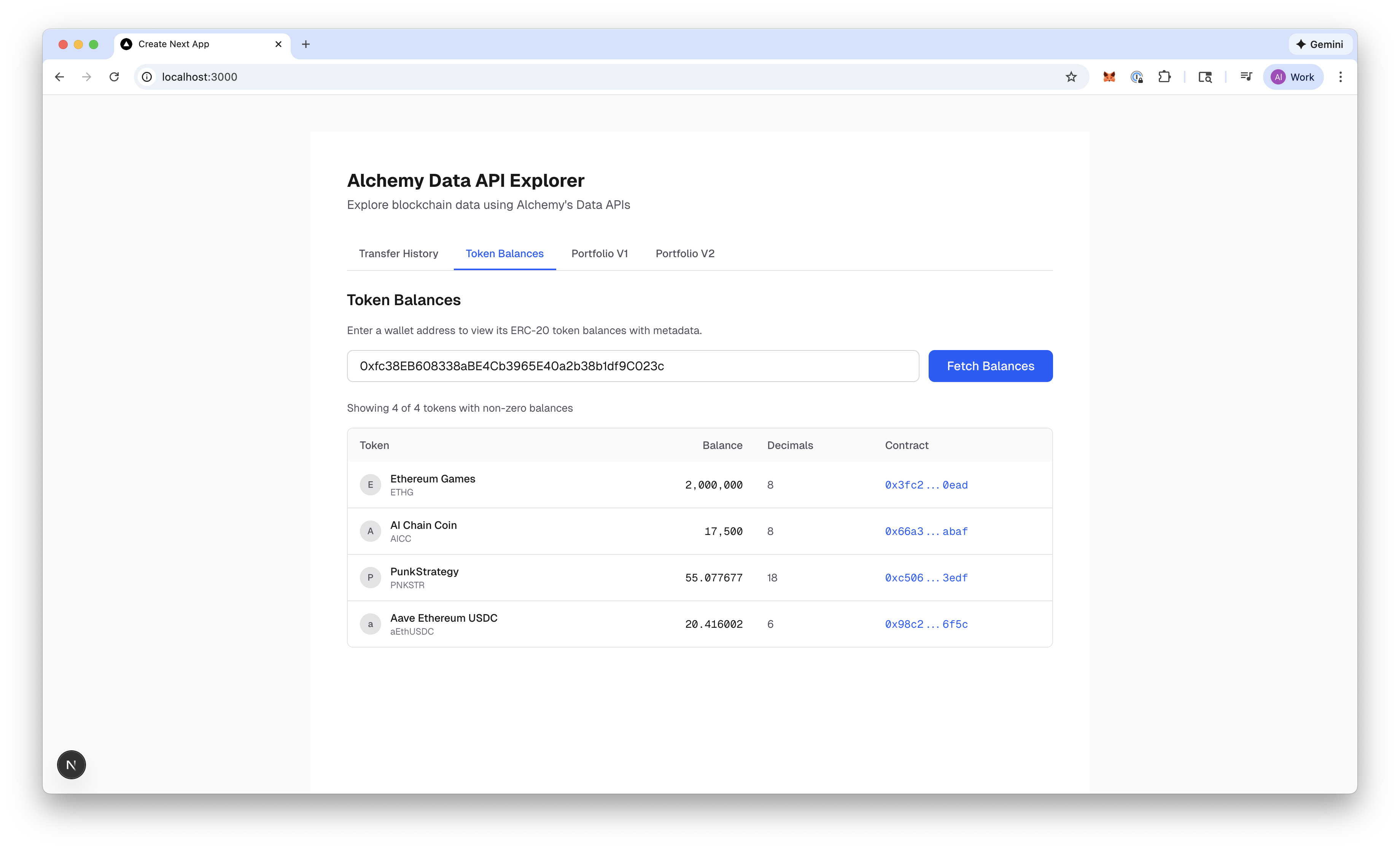 - Prompt: In a separate tab, but keeping the first component intact, replace the transfers list with a token balances table using Alchemy’s Token API. Show token metadata and current balances for the same wallet.