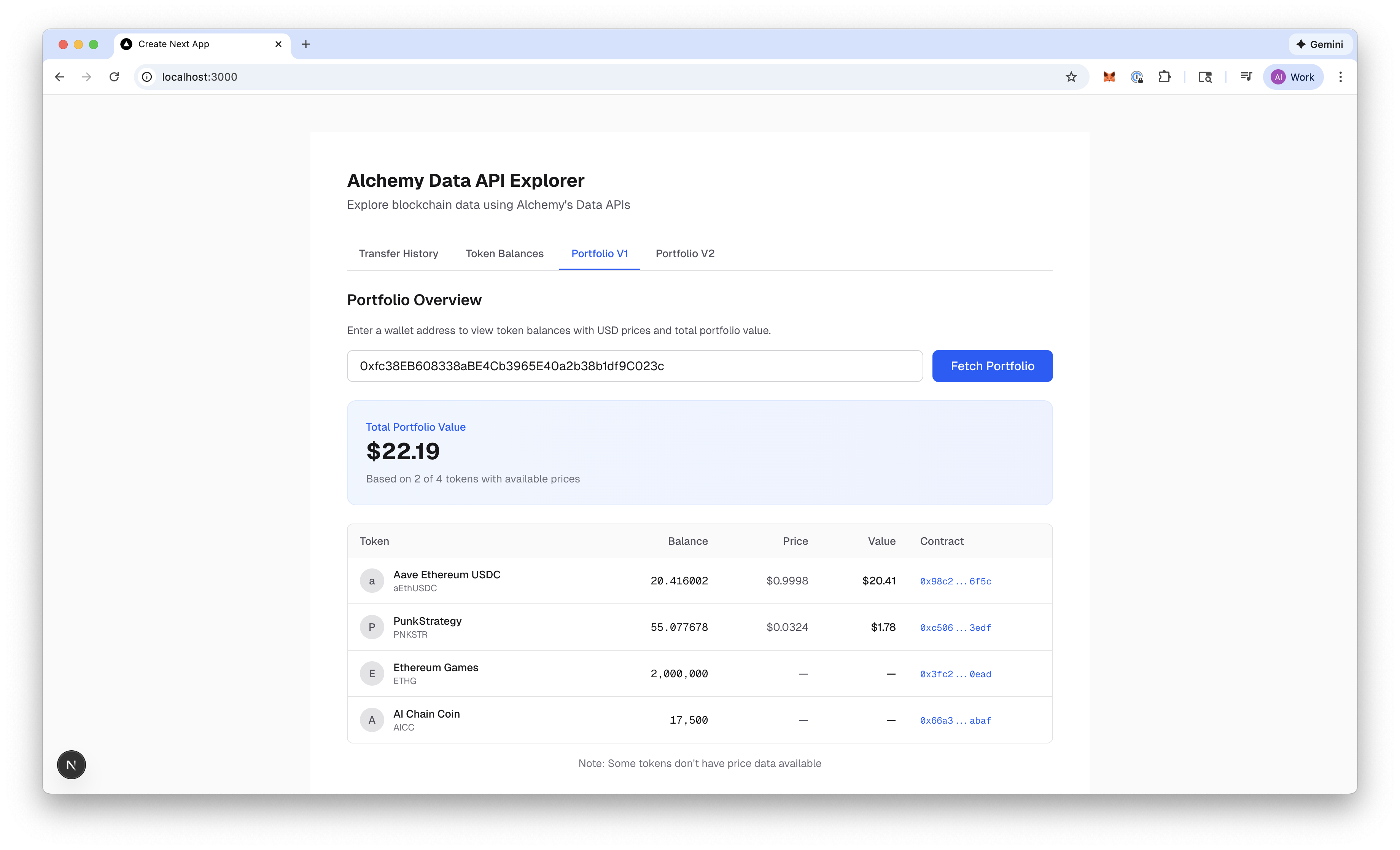 - Prompt: In a separate tab, but keeping the first and second components intact, enhance the token balances table by fetching USD prices from Alchemy’s Prices API and calculating total portfolio value. Name the tab Portfolio V1.