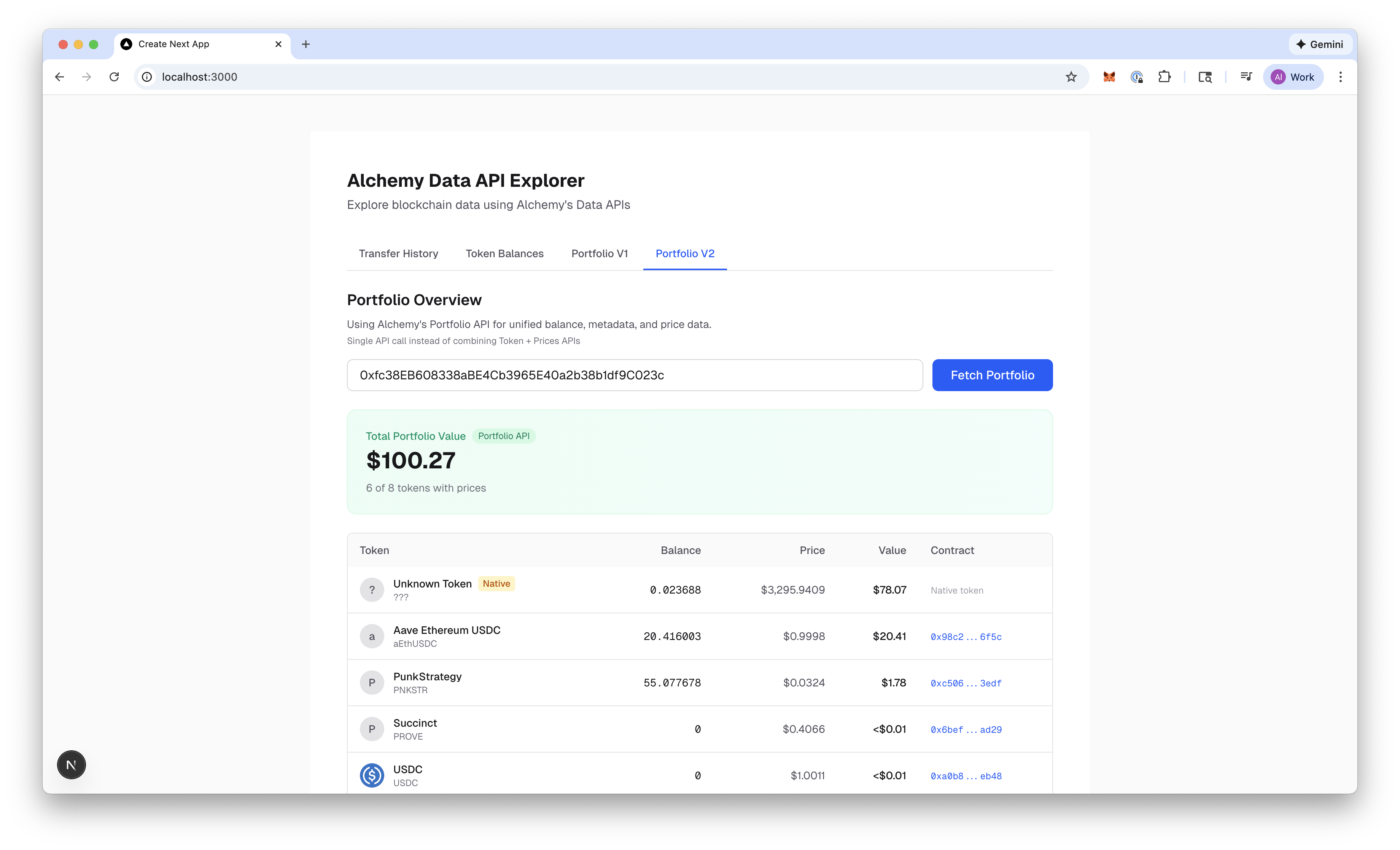 - Prompt: In a separate tab, but keeping the first, second and third components intact, refactor the latest component to use Alchemy’s Portfolio API instead of manually combining Token and Prices APIs. Name the tab Portfolio V2.