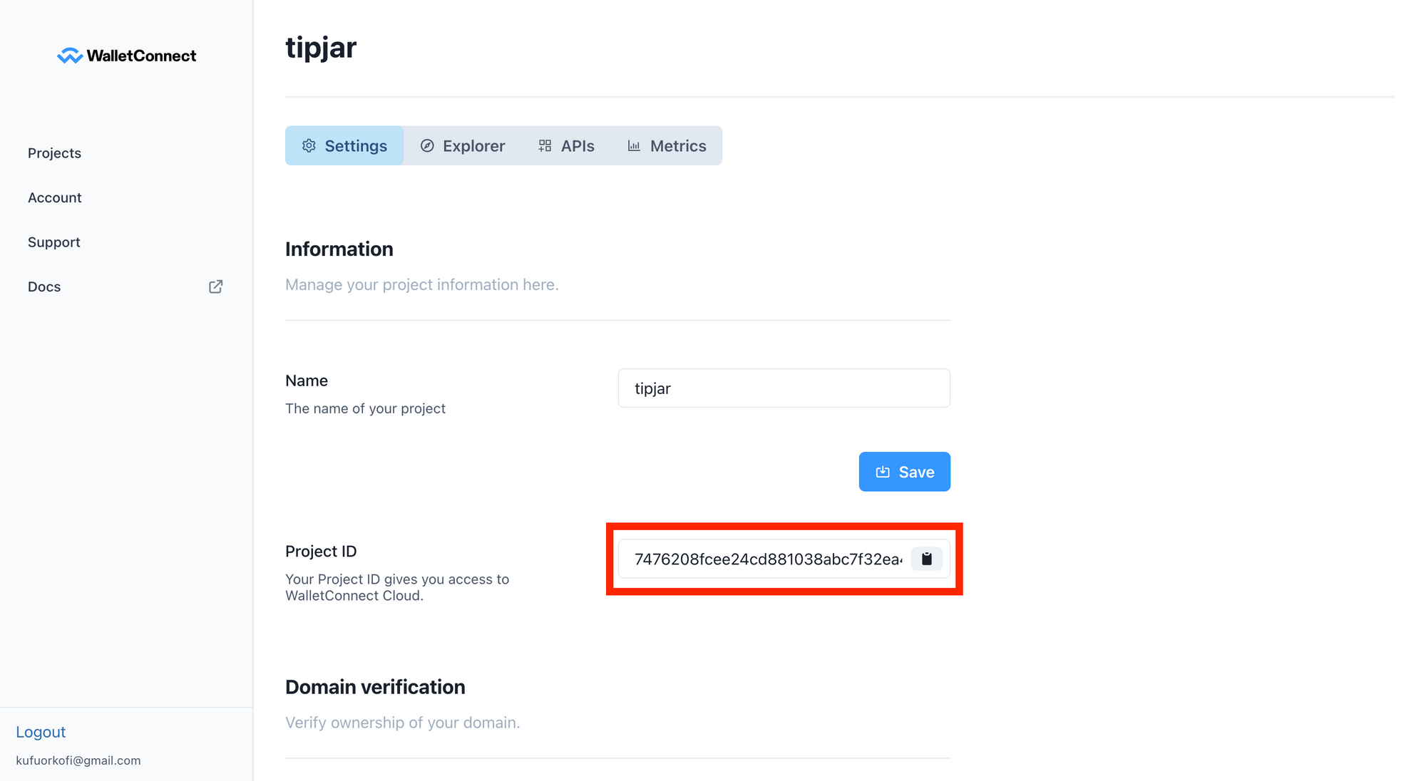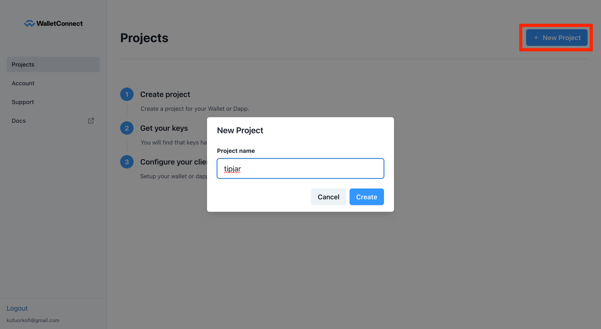In your WalletConnect dashboard, select New Project and give the project a name.