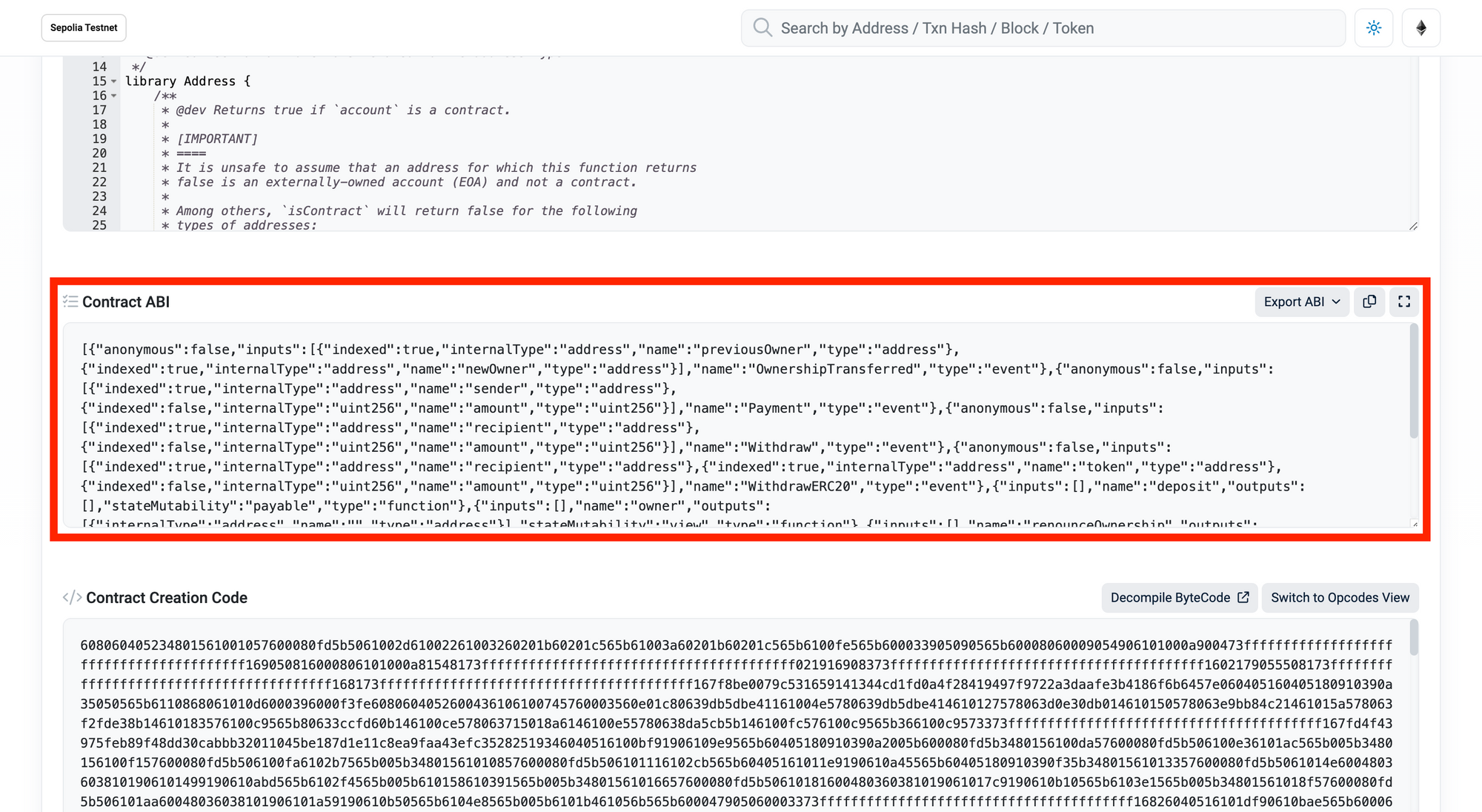To get the ABI, open the page for the contract on Sepolia Etherscan. If you’re using the pre-deployed example, search for 0x728DDDe0aB16B59df95a4D43d9692a44b7AEe944. If you’re using a newly deployed Tipjar, search for its address. Click on the Contract tab, scroll down to the Contract ABI, and copy it.