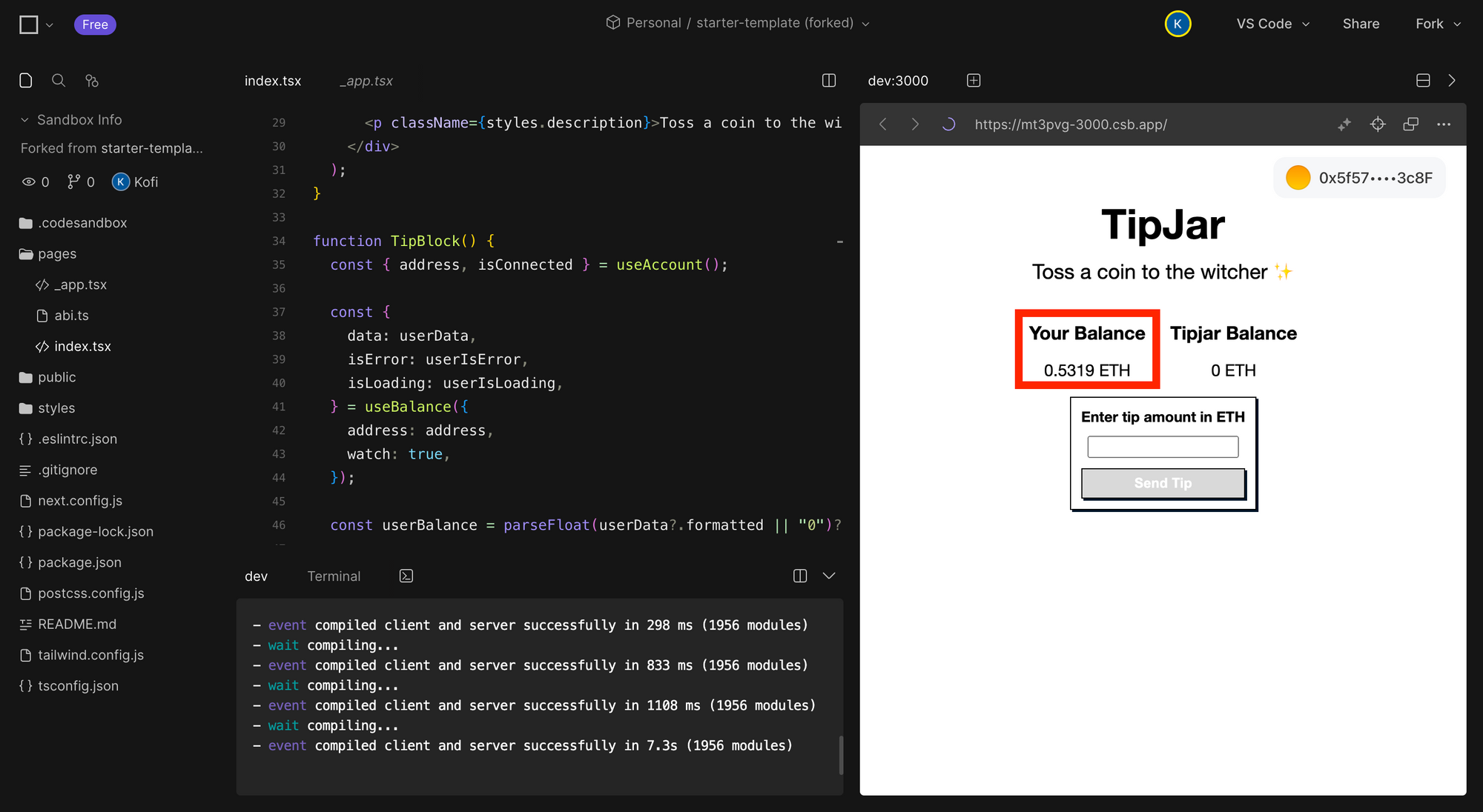 (1) Delete the TipBlock component and replace it by copy-pasting the new TipBlock code below. This new version of TipBlock adds state data for the user’s address, balance and connection status.