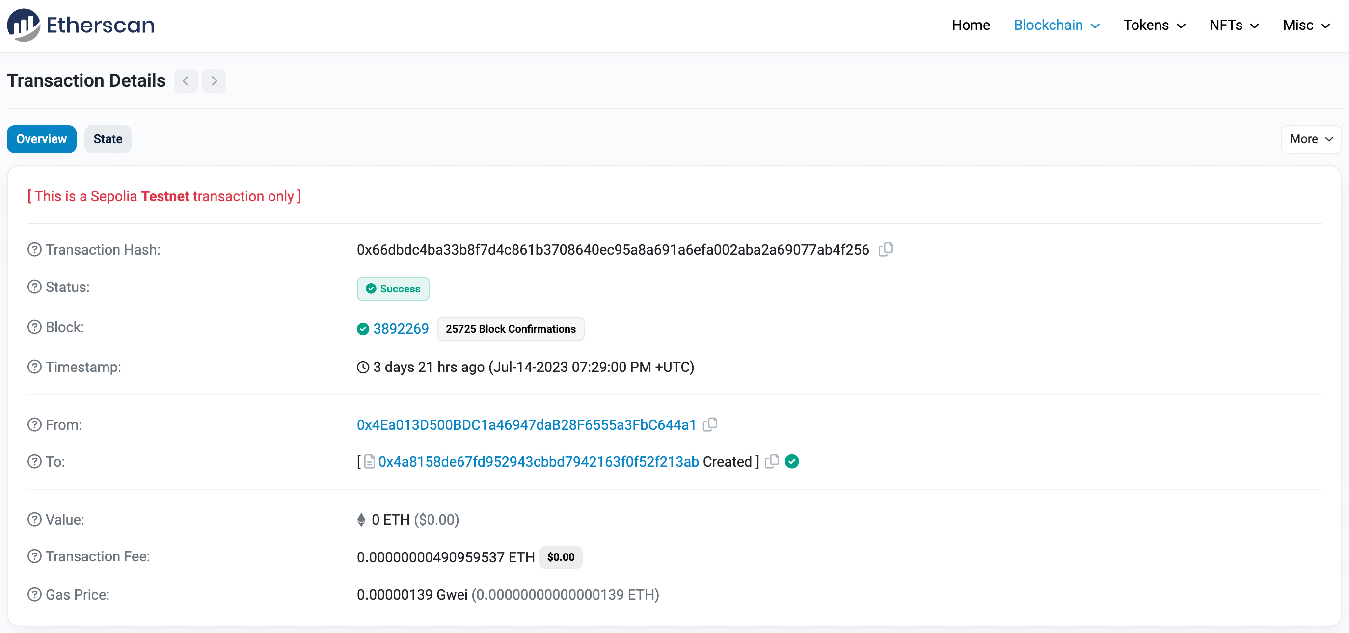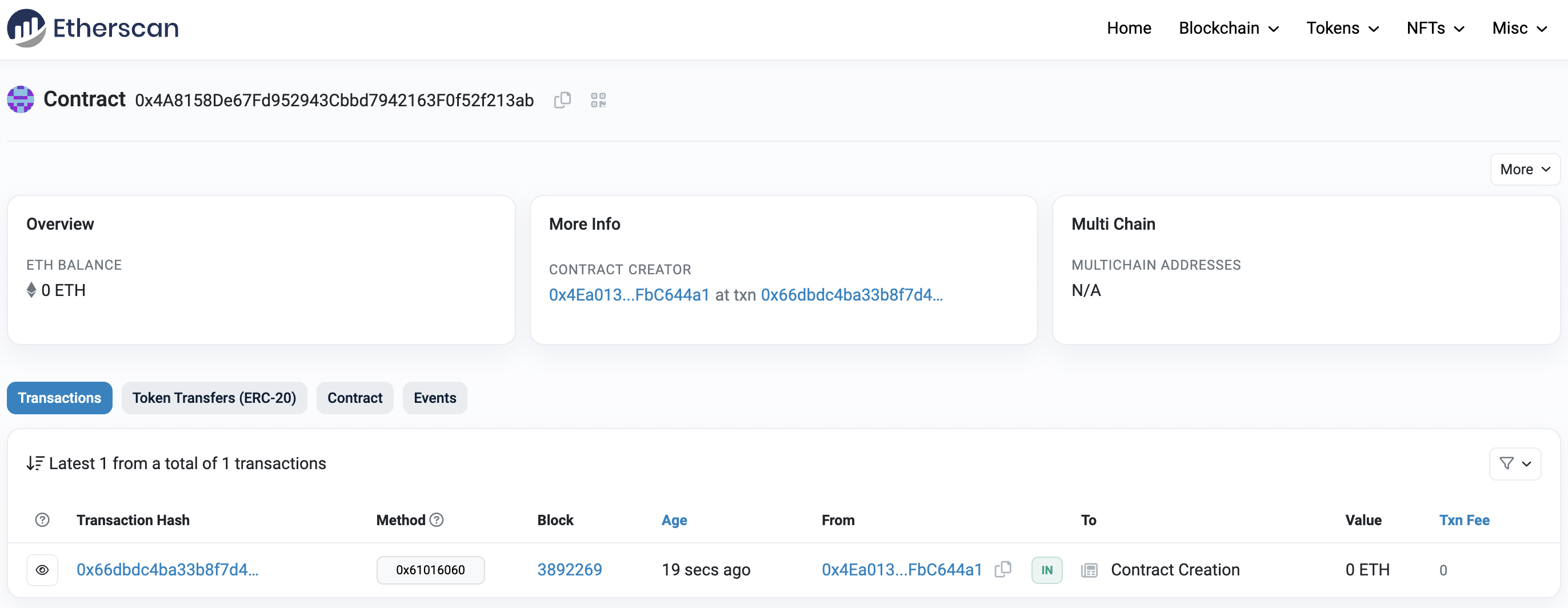 If we go to the Sepolia Etherscan and search for our contract address, we should be able to see that it has been deployed successfully. The transaction will look something like this:
