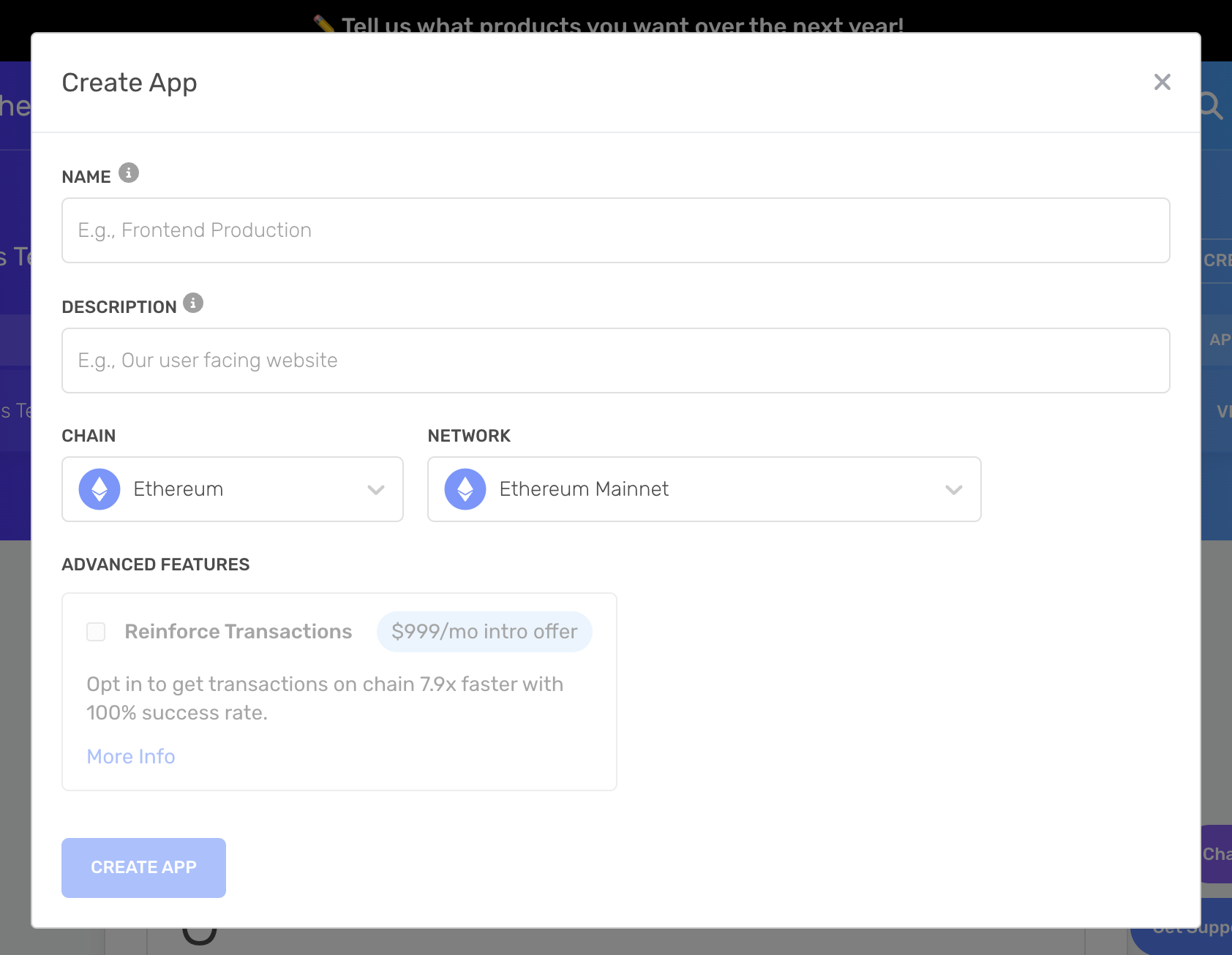 - Provide a Name and Description for your app, then choose Ethereum as your Chain and Sepolia as your Network.
