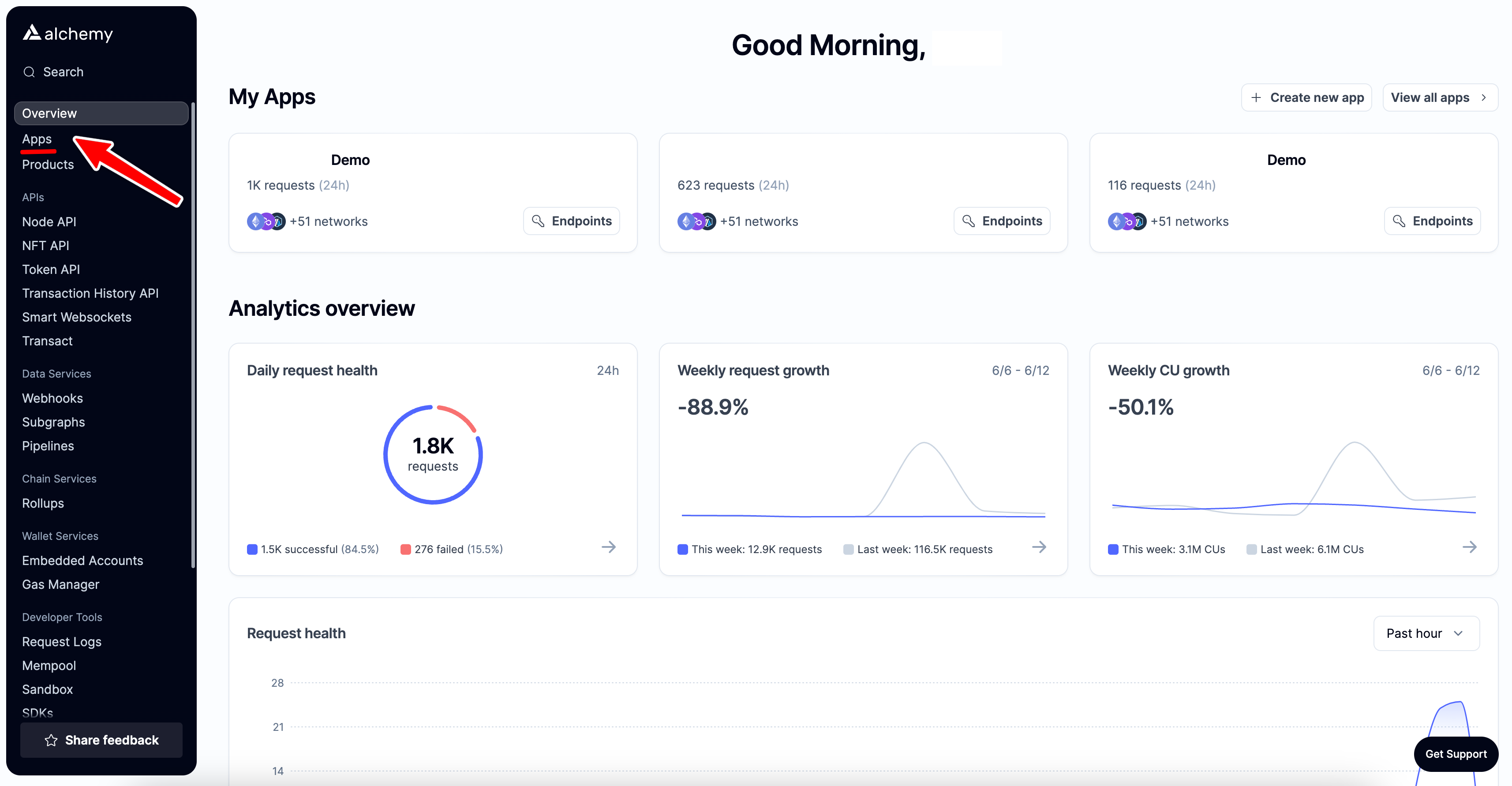 First, navigate to your Alchemy dashboard and click on the “Apps” tab.