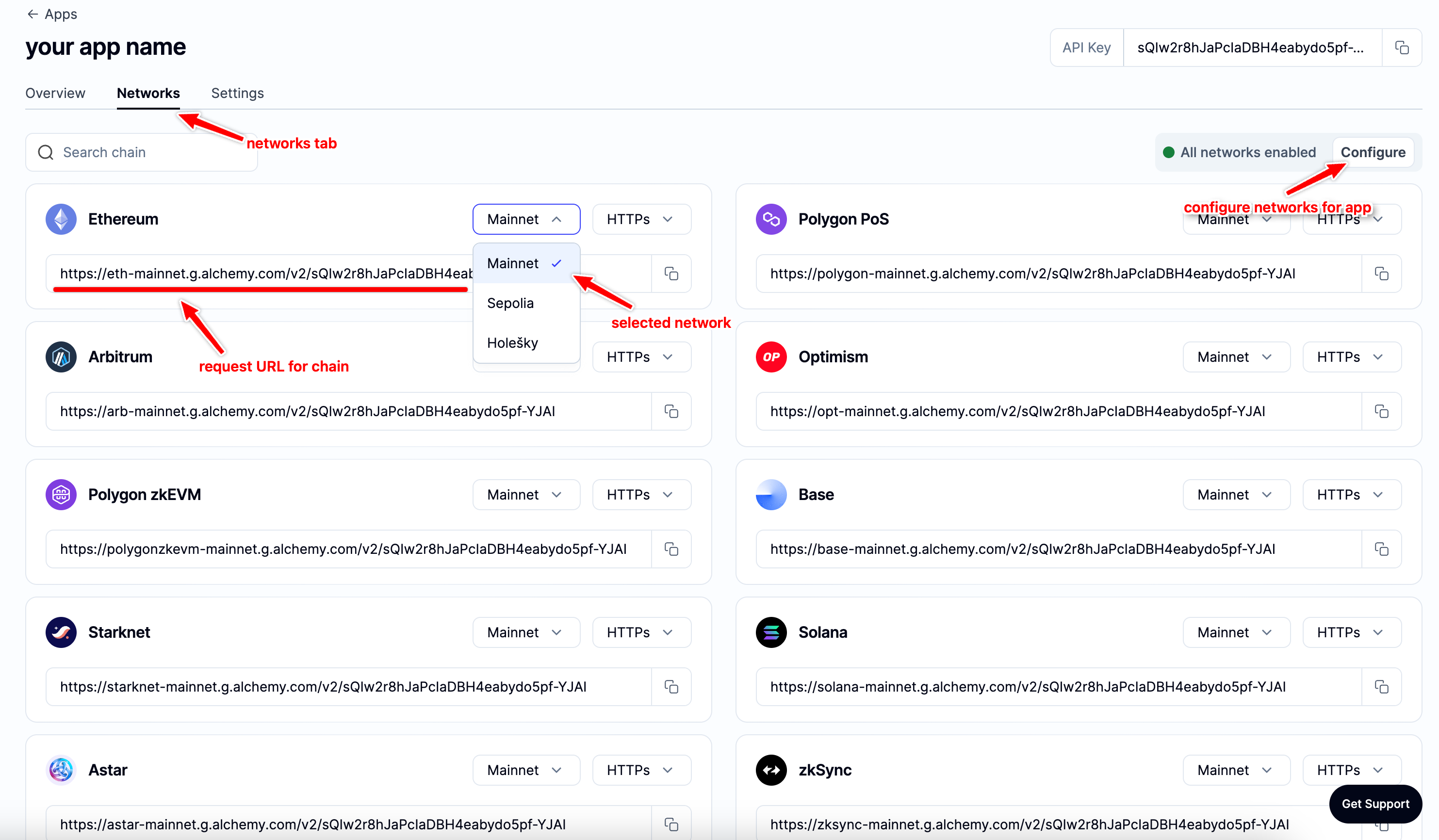 After creating an Alchemy account, you can generate an API key by creating an app. With this key, we can make requests to the Sepolia test network.