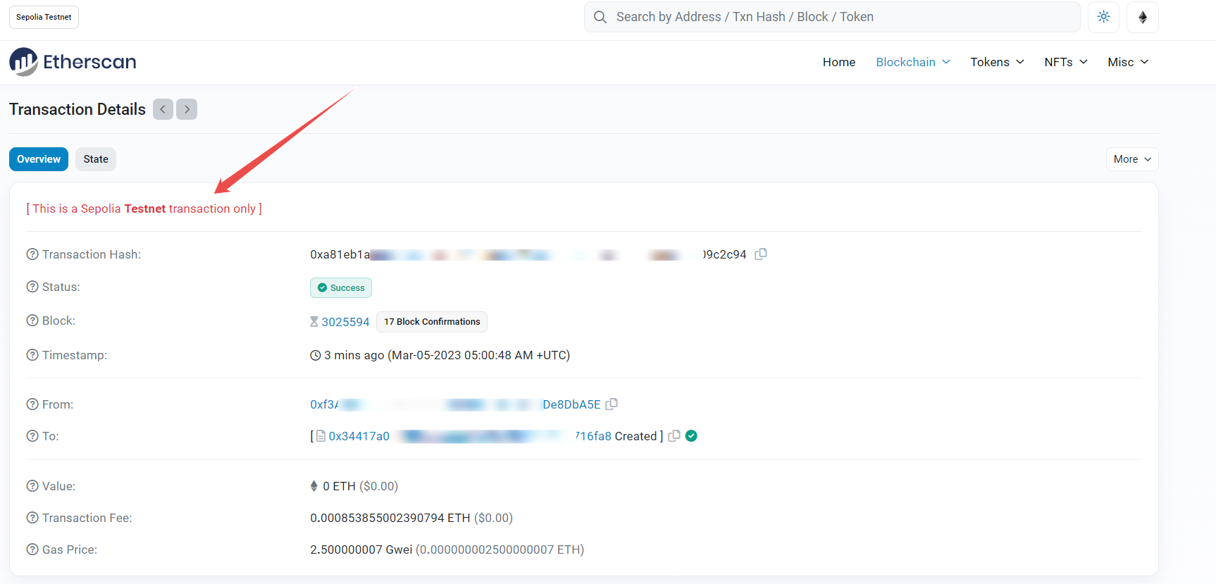 Ensure that the From address matches your Metamask account address. The To address should display “Contract Creation”, but upon clicking the transaction, we will see our contract address in the To field.