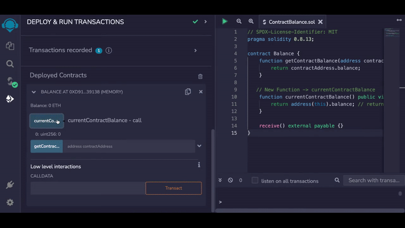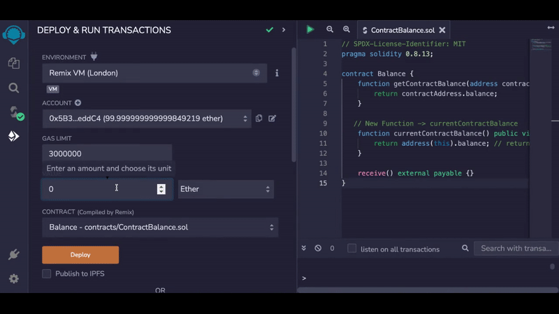currentContractBalancefunction is working properly, now let’s deploy theBalancecontract once again on another address and check the balance of the newly deployed contract using the existinggetContractBalancefunction. We expect it to return 0 because the newly deployed contract will not contain any Ether.