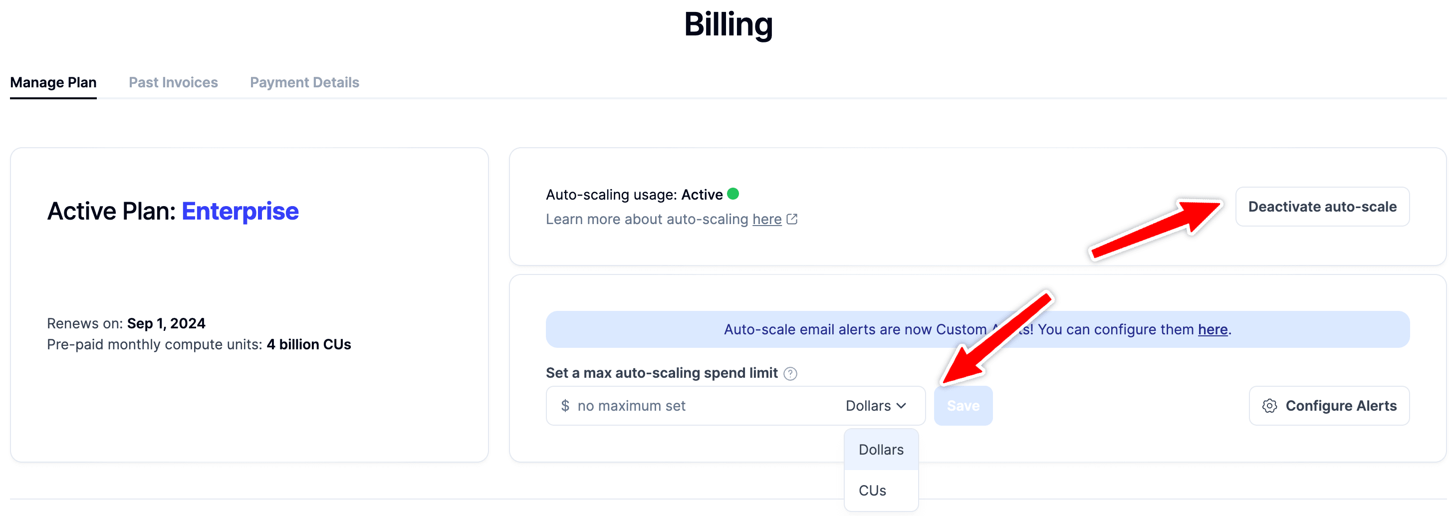 Step 3: Here you will find an option to activate/deactivate auto-scale and set a max auto-scaling spend limit in dollars or in CUs.