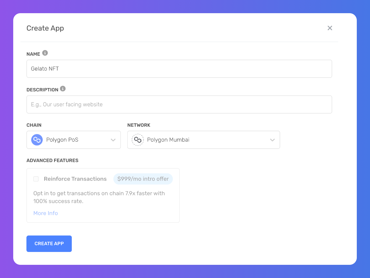 You need an API key to authenticate your requests. You can create API keys from the dashboard. Navigate to “Create App” and fill in the details to get your new key and paste it in .env..