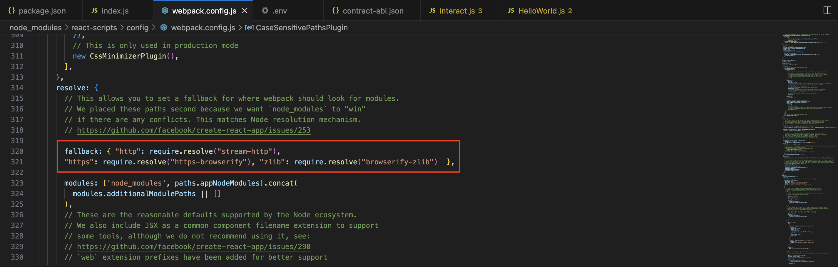 The next step is to include some of the newly installed dependencies in your webpack.config.js file. Locate the file in your node_modules react-scripts directory, i.e., /Users/...../hello-world-part-four-tutorial/starter-files/node_modules/react-scripts/config/webpack.config.js.