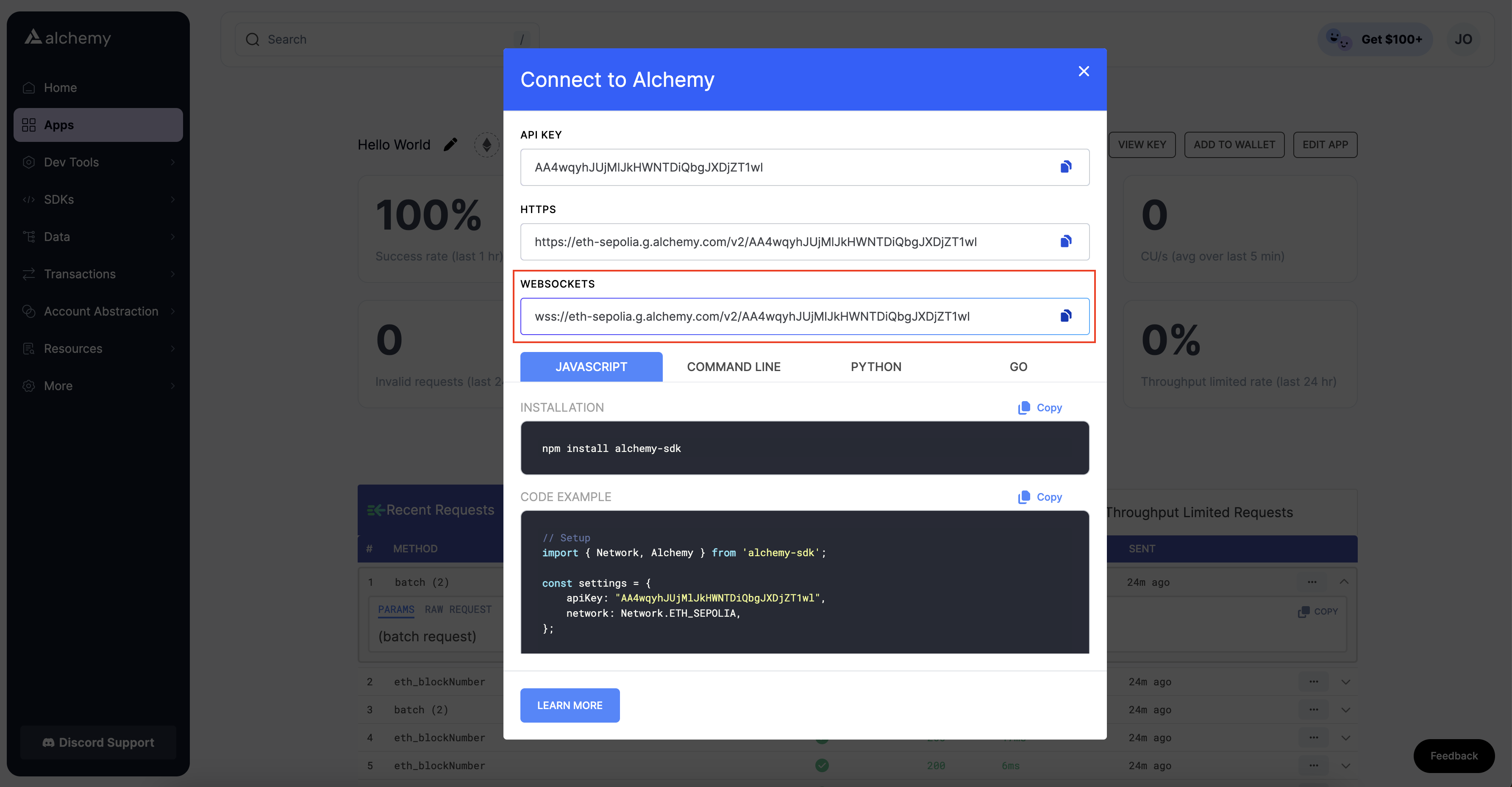 For our dApp, we will be using our Websockets API key instead of our HTTP API key, as it will allow us to set up a listener that detects when the message stored in the smart contract changes.