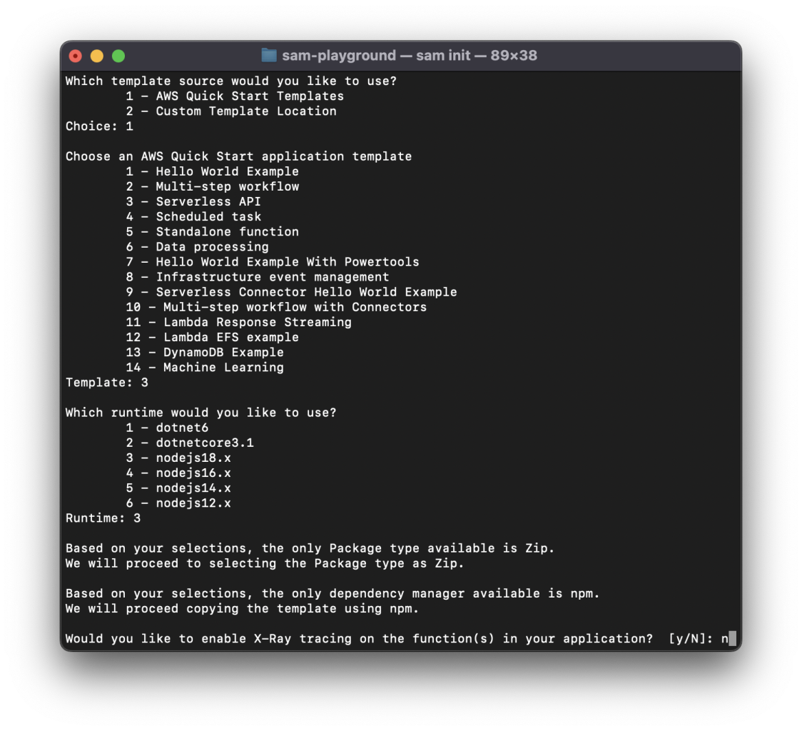By selecting the above options, we’re telling SAM to create a new serverless application starting from a template.