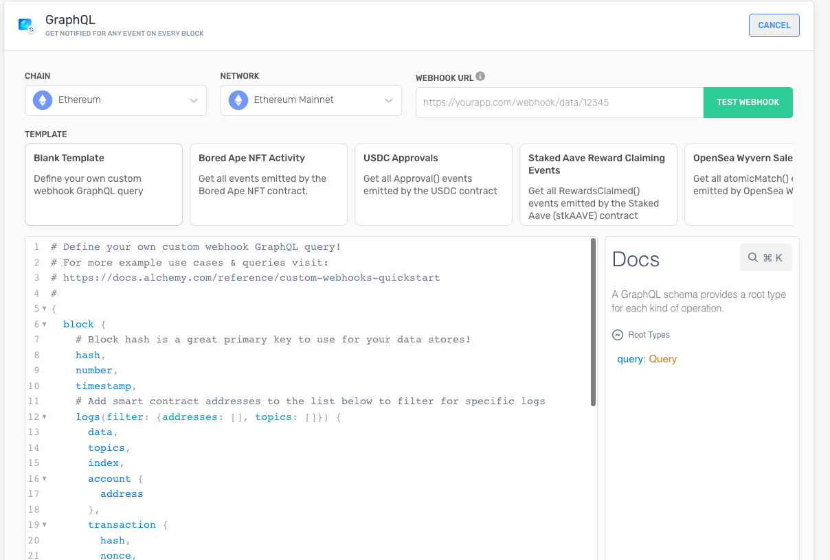 Fortunately, Alchemy Custom Webhooks can help. They allow you to track any smart contract or marketplace activity, and monitor any contract creation, or any other on-chain interaction in real-time using handy GraphQL queries. This gives developers infinite real-time and historical blockchain data access with precise filter controls.