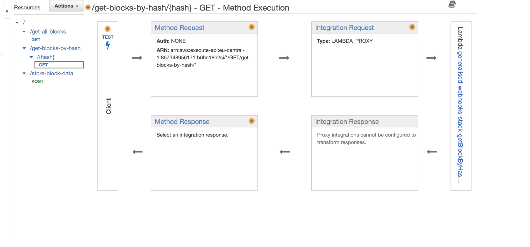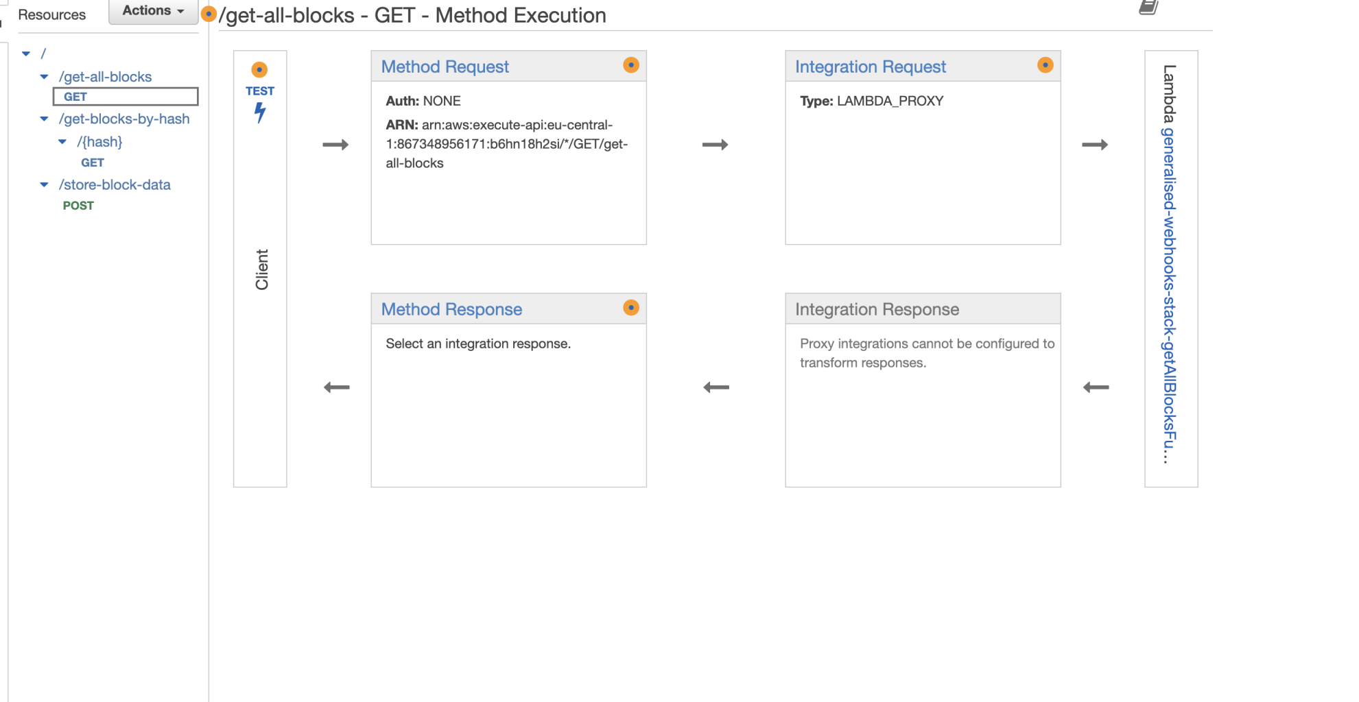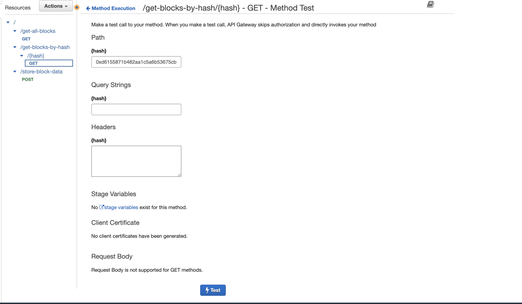 This will trigger a call to the API, GET in this case, and populate the “response body” section on the right-hand side, with the blocks data saved on your DynamoDB instance and retrieved through the lambda function we created.