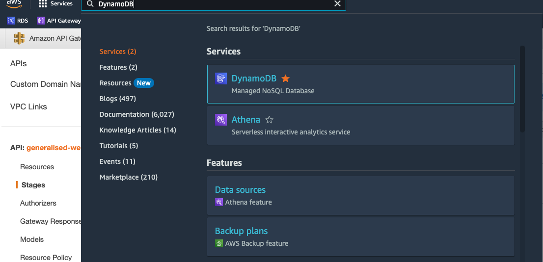 Navigate back to the AWS console, search for “DynamoDB,” and look for the “tables” section in the left-hand menu: