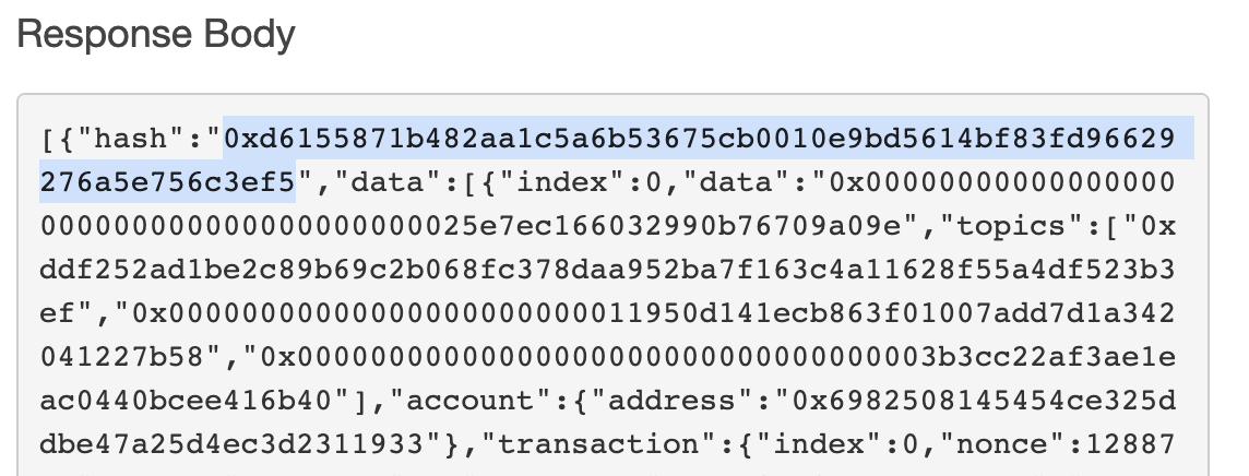 You’ll see the block data related to the hash id you’ve inserted appearing on the right end side, inside the “Response body” section.