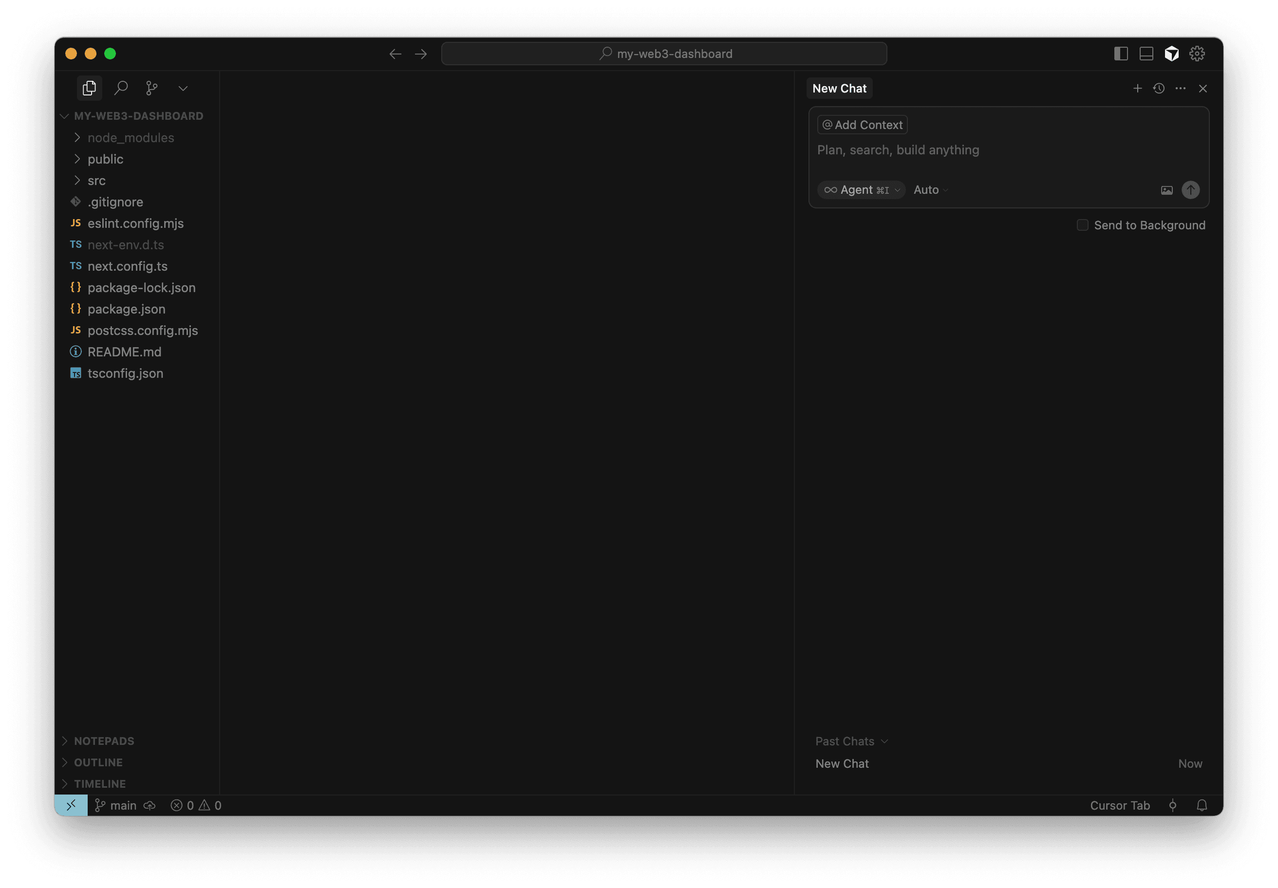 cd my-web3-dashboardIn your terminal, run code . to open the Cursor application. It should look like this after running the command from the previous step: