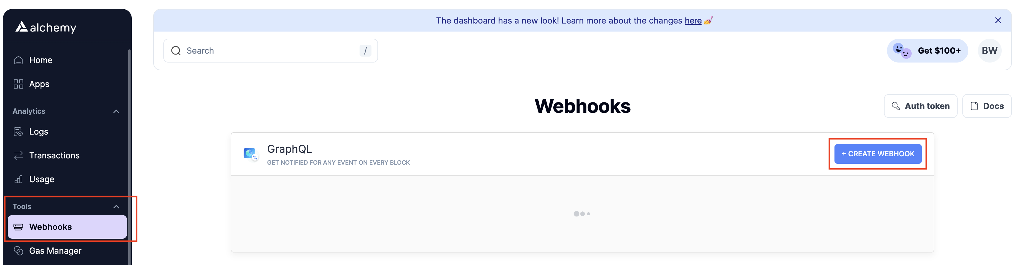 Sign up or log into your Alchemy account and create a new custom webhook.